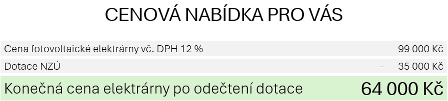 - Zajistíme pro Vás kompletní realizaci fotovoltaického systému – od odborného návrhu až po uvedení do provozu. Součástí našich služeb je i vyřízení dotace dle aktuálně platných dotačních podmínek. Vy se nemusíte o nic starat – vše vyřídíme za Vás.